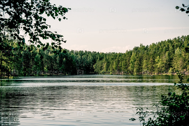 Пейзаж реки Вуокса среди камней, быстрый поток воды в резервуар при свете дня российского лета