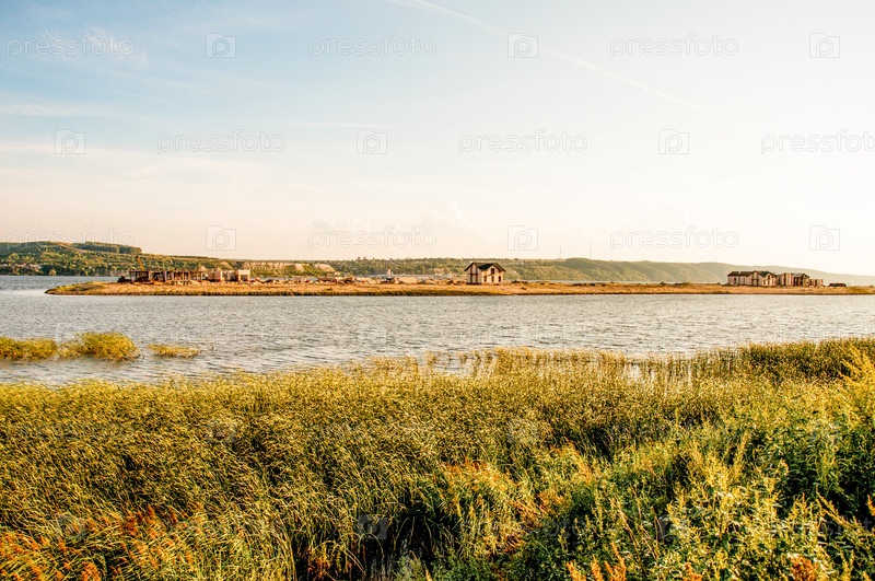 Широкая река Волга течет по долинной равнине в солнечный летний день в центральной России