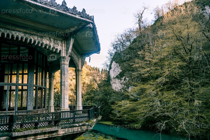 Спокойная река, протекающая в Абхазии, летний пейзаж на облачном дне панорама