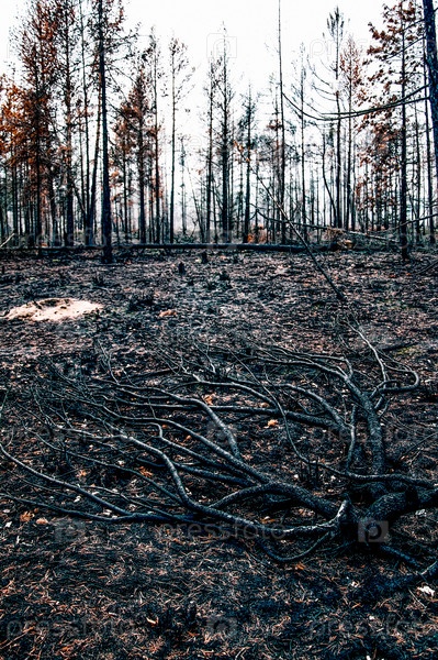 Пустынный пейзаж сгорел в лесу, сухие деревья не покидали фона голубого неба Карелии