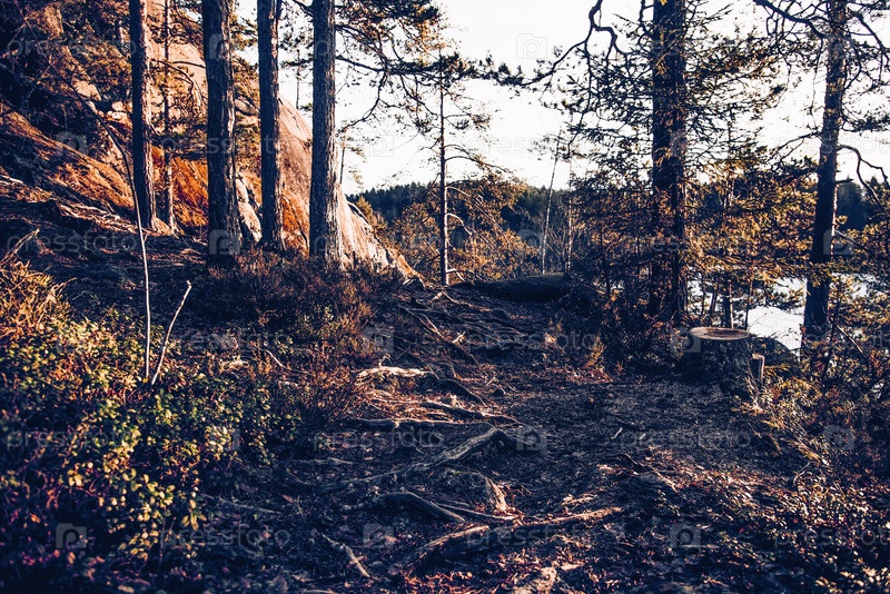 Зеленый лесный ландшафт летнего лета - пихта, трава и облачное небо в Карелии