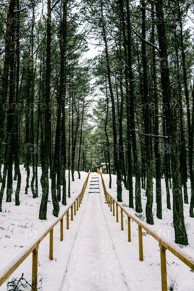 Зимний лесный пейзаж, снежные деревья небо, яркий облачный день