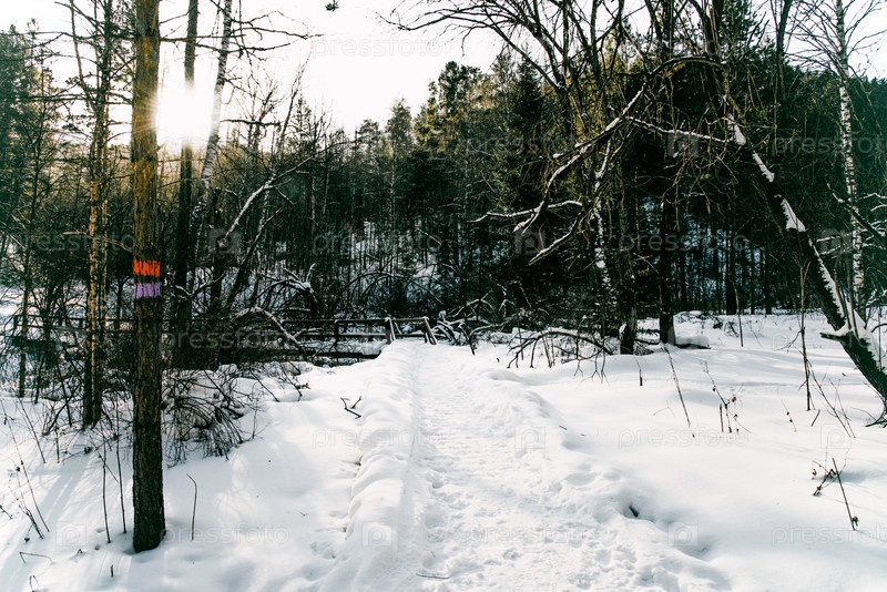 Зимний лесный пейзаж, снежные деревья небо, яркий облачный день