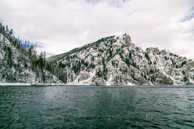 Красноярское водохранилище на реке Енисей, зимний пейзаж в пасмурный день в Сибири
