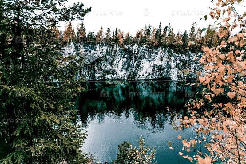 Гранитный мраморный карьер с озером Рускеала в Карелии, Россия, летний пейзаж
