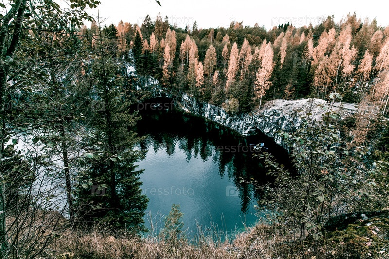 Гранитный мраморный карьер с озером Рускеала в Карелии, Россия, летний пейзаж