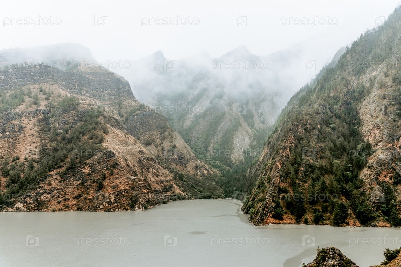 Водохранилище, озеро на Кавказе, Дагестан, Россия, летний пейзаж в солнечный день горные ландшафты