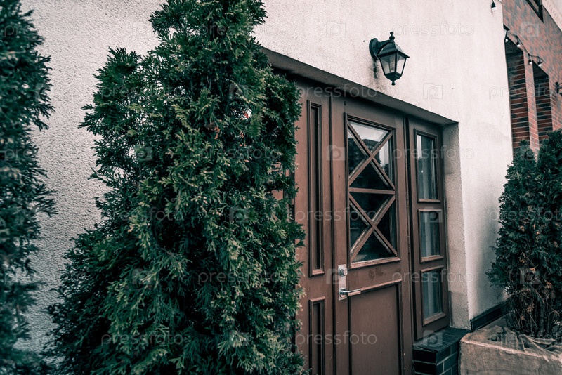 Входная дверь в небольшой жилой городской дом по соседству, за пределами здания на улице