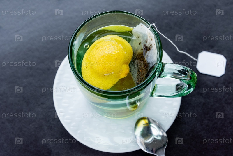 Упакованный растительный здоровый напиток из черного чая с лимоном заваривается в стеклянной кружке на столе