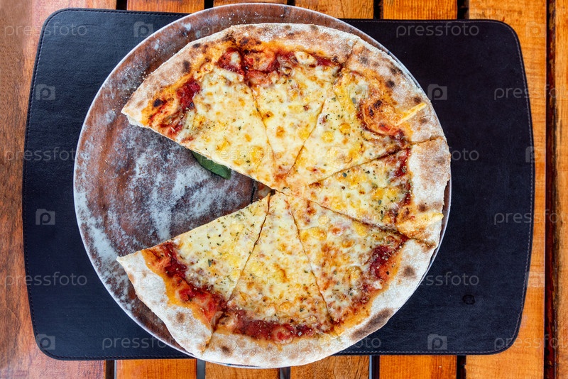 Маргарита пицца нарезана на кусочки в круглом аудитории, итальянские выпечки в ресторане