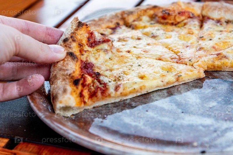 Посетитель пиццерии держит кусок итальянской маргариты