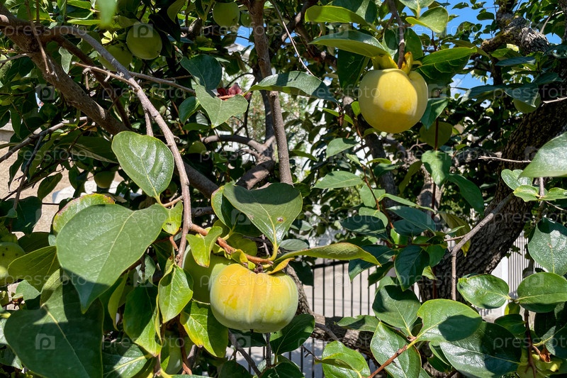 Незрелый зеленый персимон висит на ветке дерева, плоды растут в саду и ферме