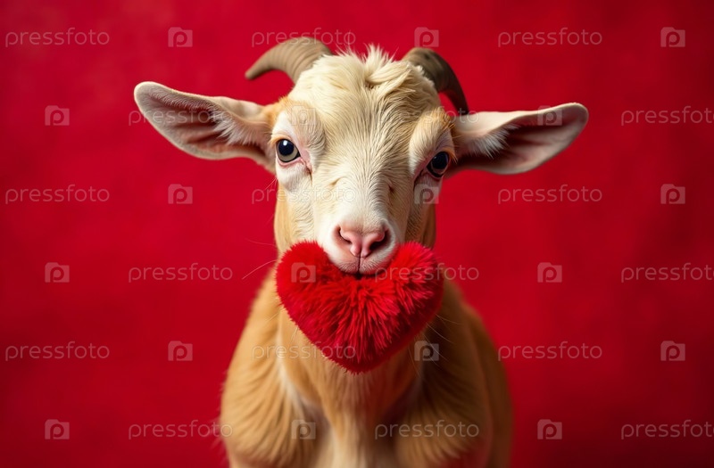 Карточка на День святого Валентина, коза с пушистым красным фоном сердца