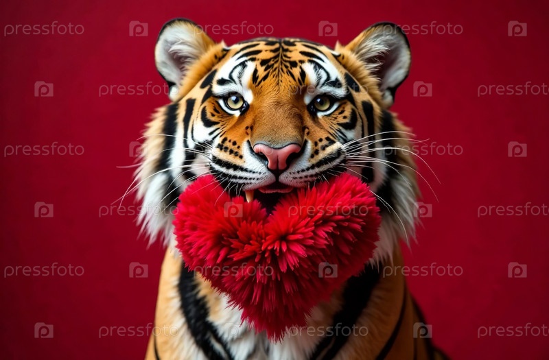Карта Дня Святого Валентина, тигр держит пушистое сердце на красном фоне
