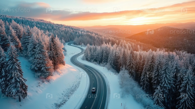Извилистая дорога извивается через заснеженный горный пейзаж под потрясающим закатом