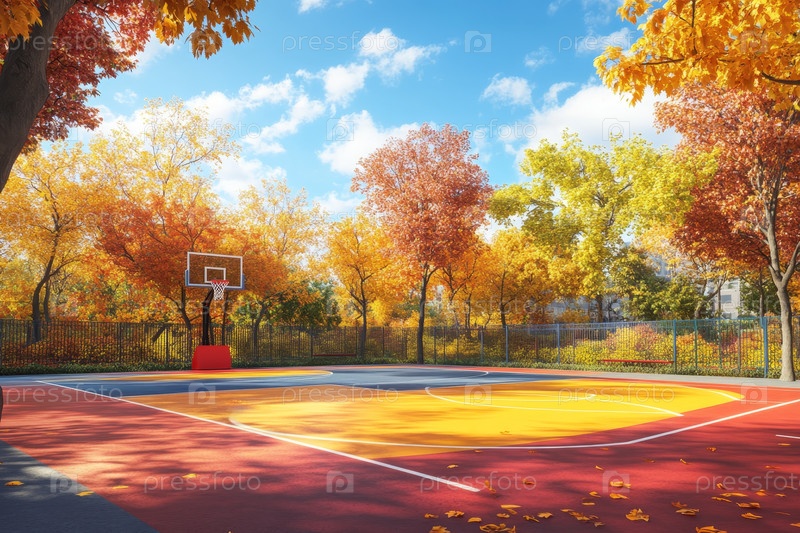 Спокойный баскетбольный корт в окружении ярких осенних деревьев приглашает игроков насладиться солнечным днем на свежем воздухе