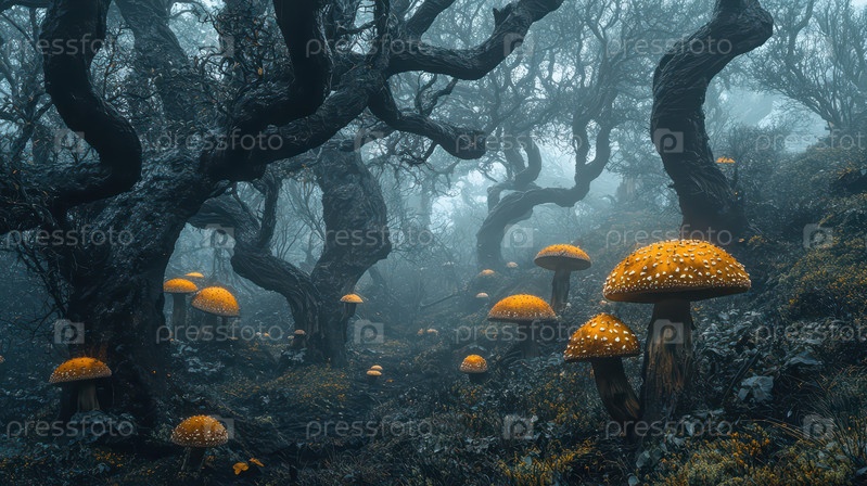 Таинственный лес с светящимися оранжевыми грибами