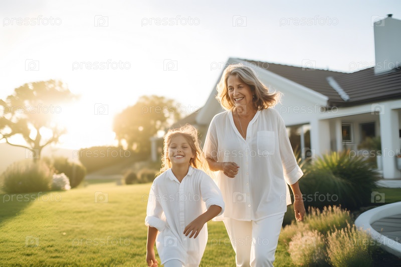 Пожилая женщина, держащая руку своей внучки гуляет по парку