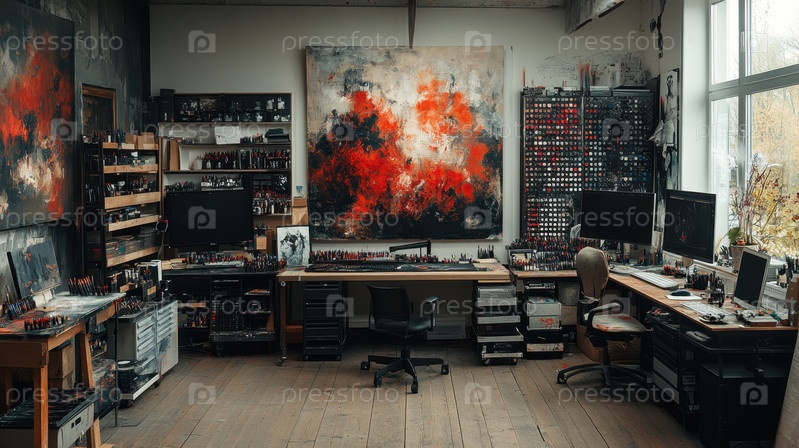 Художественная студия с абстрактными картинами и творческим рабочим пространством