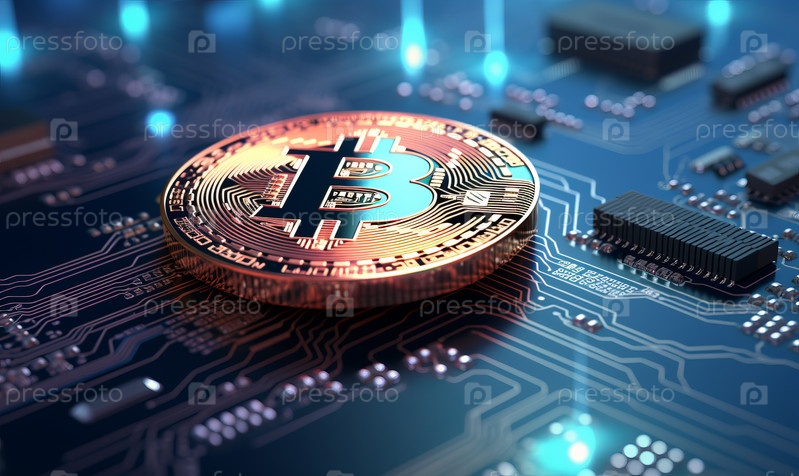 Биткойн-монета лежит на сложном чипсете, метафорически представляющем цифровые процессы майнинга и транзакций криптовалют