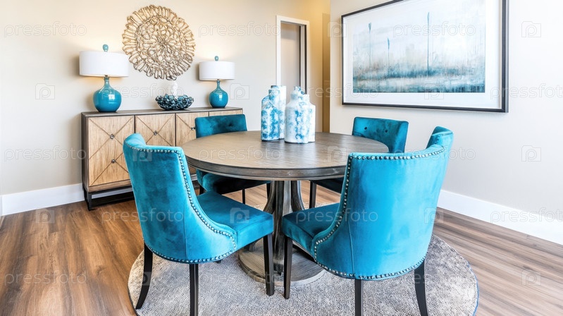 Элегантная современная столовая с синими бархатными стульями и искусством