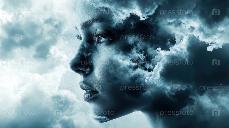 Драматическая двойная экспозиция лица спокойной женщины смешивается с темными, текстурированными штормовыми облаками, вызывая эмоции интроспекции и меланхолии