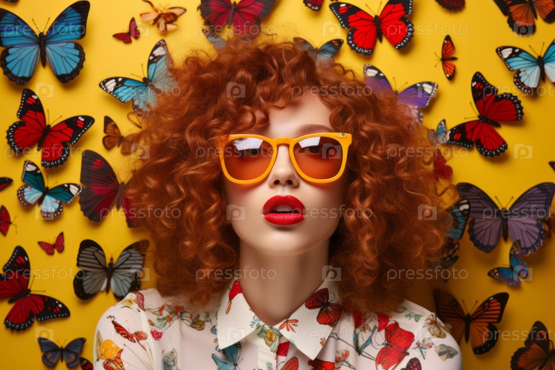 Портрет женщины с бабочками в голове творческий фон со стильной женщиной модный портрет летний стиль