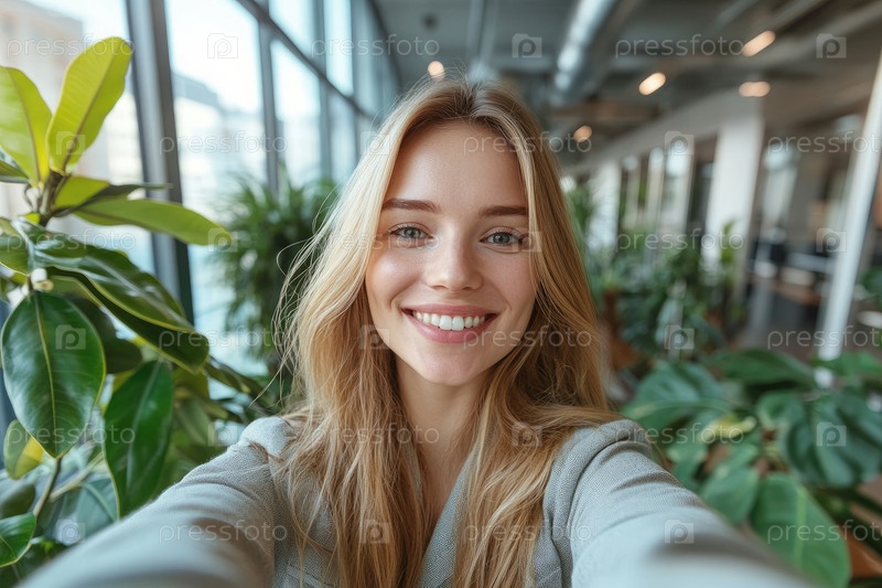 Профессиональное селфи в современном зеленом офисе со солнечным светом и растениями