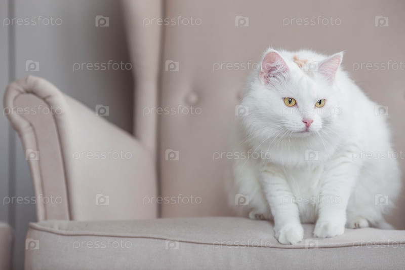Молодой белый пушистый кот сидит на бежевом стуле в гостиной