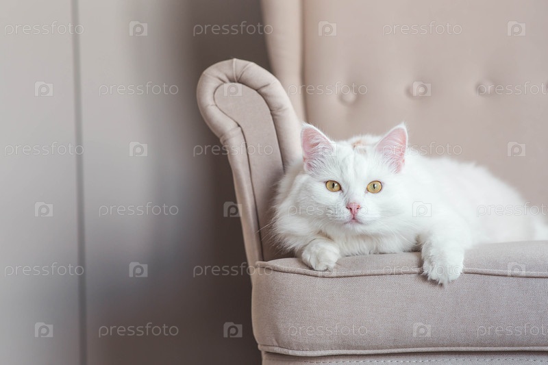 Молодой белый пушистый кот сидит на бежевом стуле в гостиной
