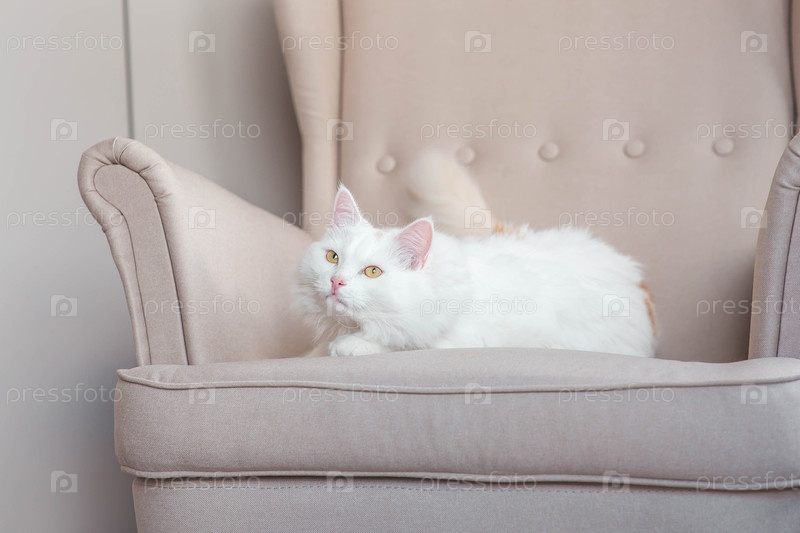 Молодой белый пушистый кот сидит на бежевом стуле в гостиной