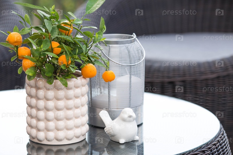 Мандаринка с фруктами в интерьере уютной террасы или patio. Цитрусовые и комнатные растения. Концепция ландшафтного дизайна дома. Цитрусные растения для интерьера