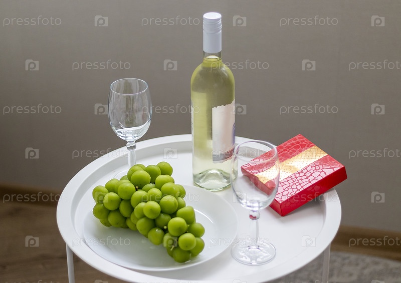 Бутылка белого вина, большой виноград, коробка конфет, бокала с вином на маленьком столе
