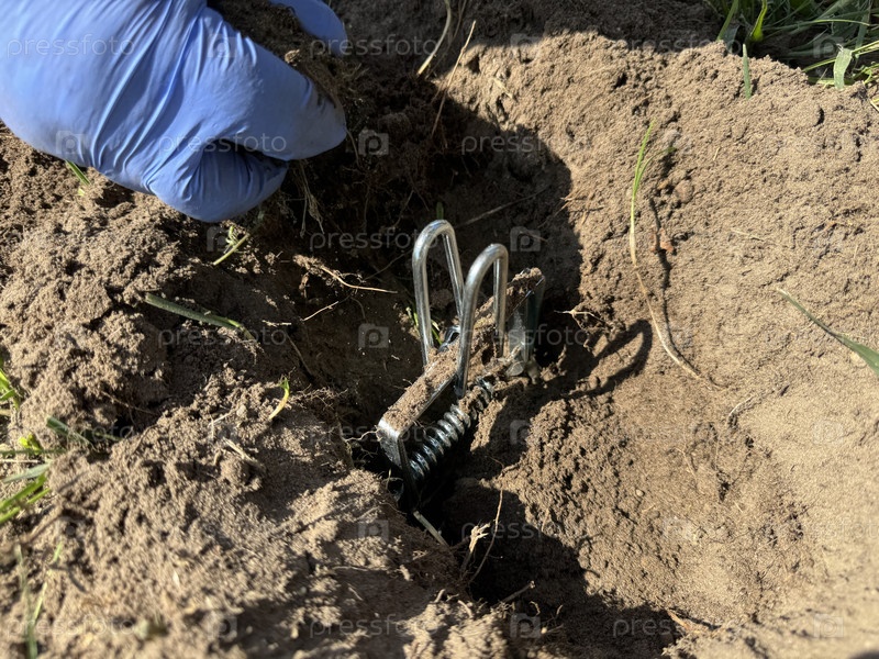 Человек устанавливает механическую кроткую ловушку из оцинкованной стали, помещенную в червоточину