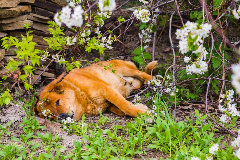 Бродячая собака лежит на земле среди травы и ветвей