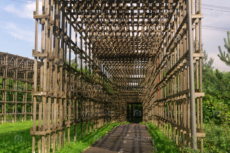 Деревянная галерея над велосипедной дорожкой в парке, проходящая под коленом