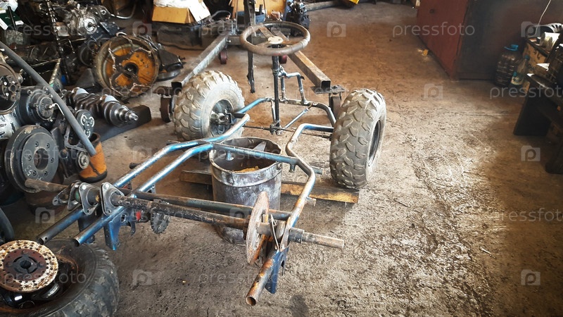 Специально построенное картинговое шасси строится в мастерской с различными инструментами и деталями, разбросанными вокруг