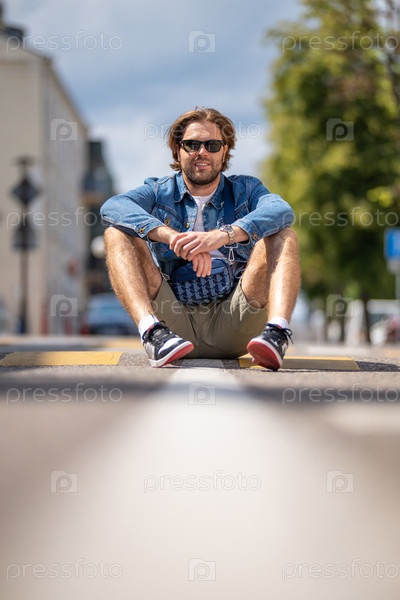 Молодой человек в случайных шортах и джинсовой куртке сидит на пешеходном переходе