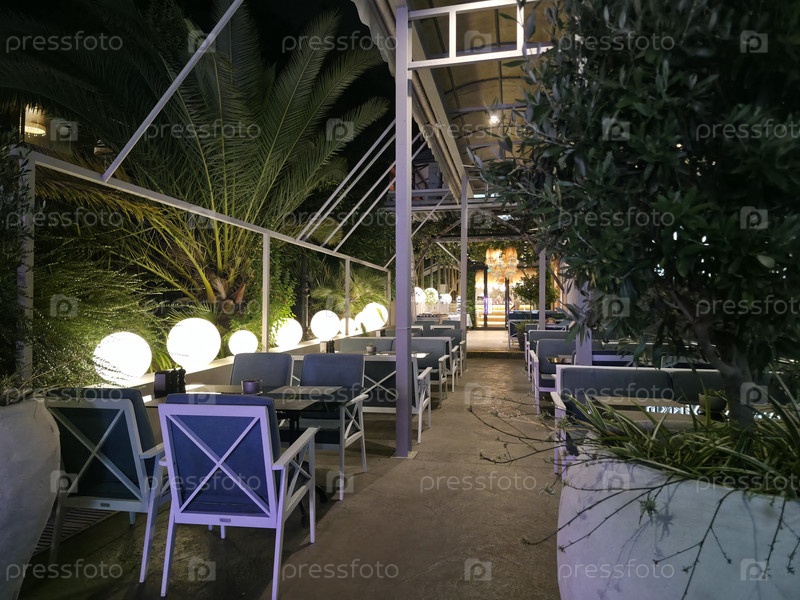 Современное кафе в Сочи: вечерняя терраса со сферическими лампами и оливковыми деревьями