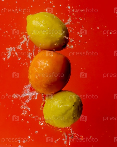 Плавающие цитрусовые фрукты брызгут красным фоном