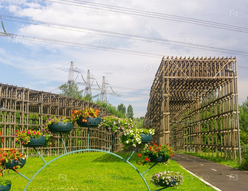 Деревянная крыша над велосипедной дорожкой в парке защищает от возможного падения линий электропередач