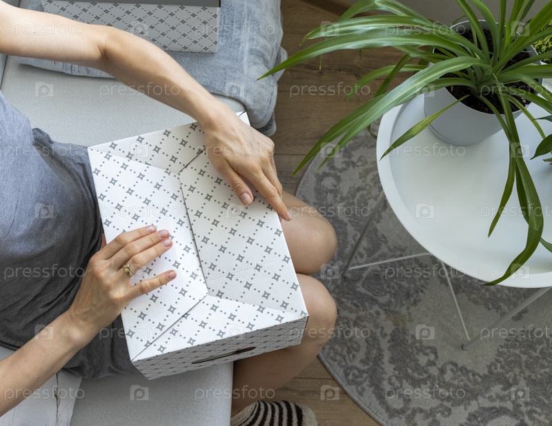 Женщина, сидящая на диване в уютной комнате, собирает картонную коробку