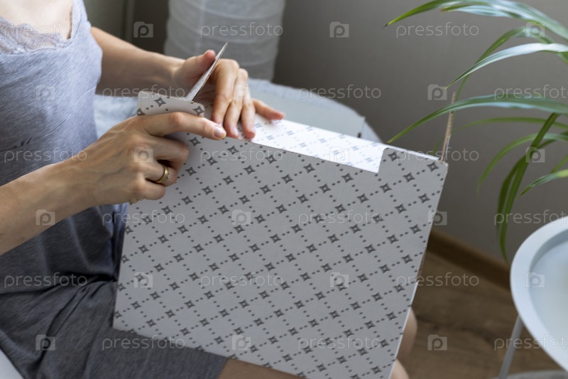 Женщина, сидящая на диване в уютной комнате, собирает картонную коробку