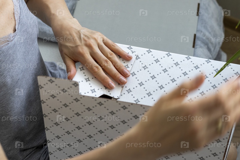 Женщина, сидящая на диване в уютной комнате, собирает картонную коробку