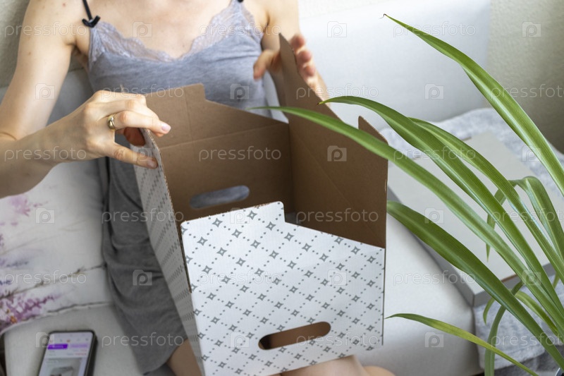 Женщина, сидящая на диване в уютной комнате, собирает картонную коробку
