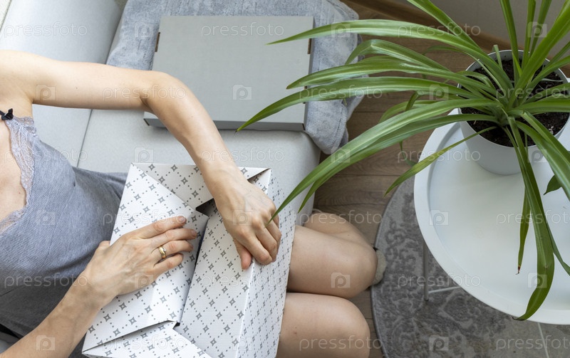 Женщина, сидящая на диване в уютной комнате, собирает картонную коробку