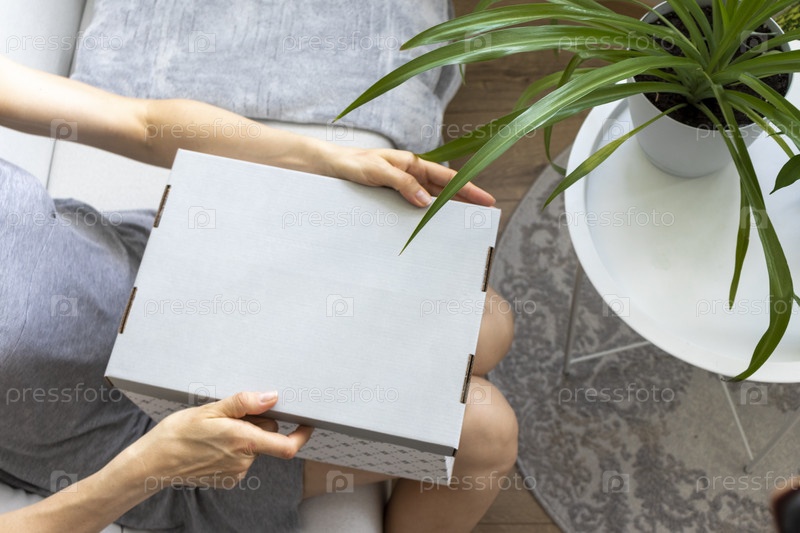 Женщина, сидящая на диване в уютной комнате, собирает картонную коробку