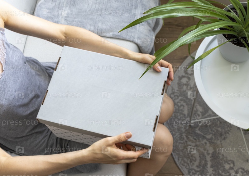 Женщина, сидящая на диване в уютной комнате, собирает картонную коробку