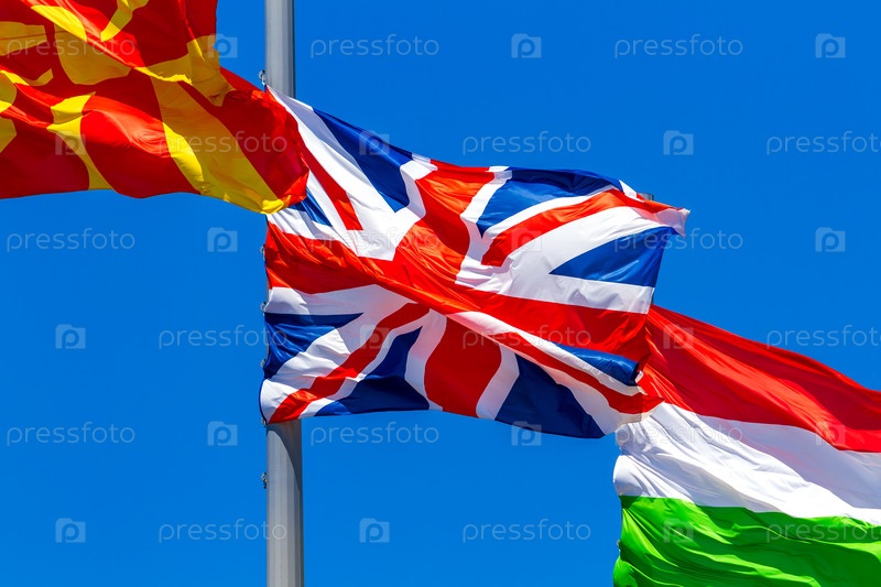 Флаги Великобритании, Македонии и Венгрии поднимаются на ветру против голубого неба