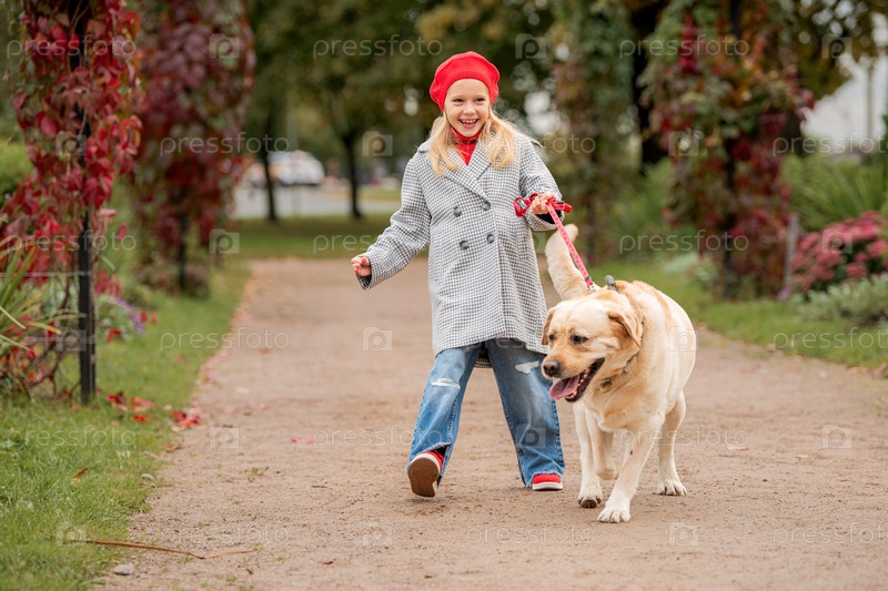 Нехороший лабрадор тянет свою хозяйку на поводке по тропинке осеннего парка